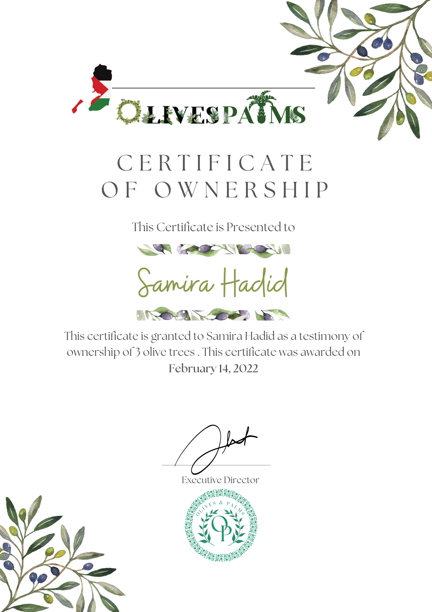 Within 48 hours you will recieve your offical Olive Tree Certificate