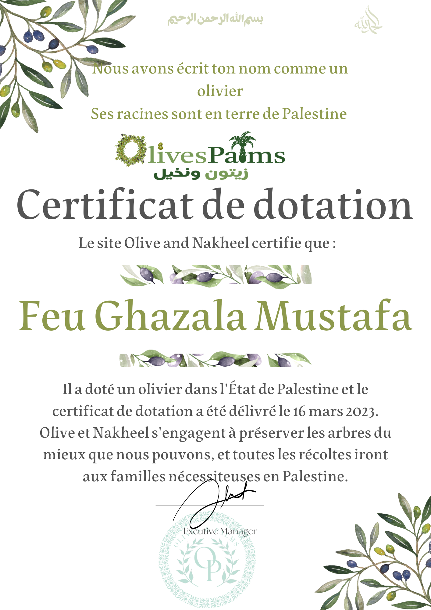 Officiellement, les arbres sont plantés dans un délai n'excédant pas 10 jours ouvrables. Les oliviers et les palmiers prennent soin des arbres, tels que l'arrosage, la taille et la récolte. Et nous nous engageons à ce que la récolte ira aux familles du peuple de Palestine d'olives, d'huile et de bois de chauffage.Les vidéos de plantation et le certificat seront envoyés au numéro joint à la facture du client.